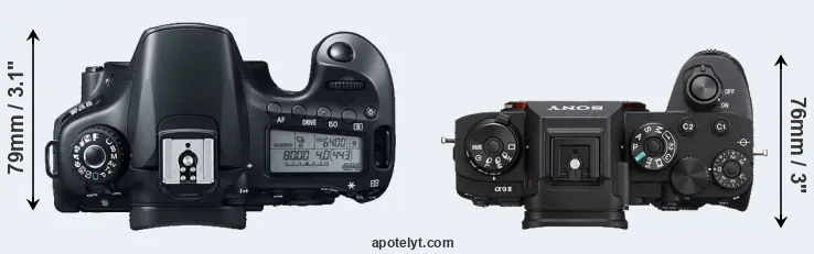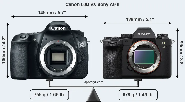 The physical size and weight of the Canon 60D and the Sony A9 II are illustrated in the side-by-side display below. The two cameras are presented according to their relative size. Three consecutive views from the front, the top, and the rear side are shown. All size dimensions are rounded to the nearest millimeter.