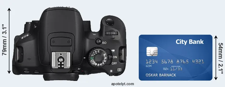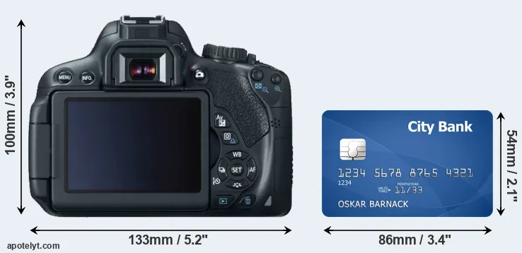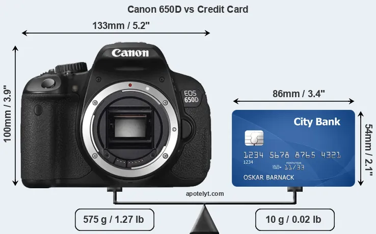The side-by-side display below illustrates the physical size of the Canon 650D vis-à-vis a credit card. Three successive views from the front, the top, and the rear are shown. All size dimensions are rounded to the nearest millimeter.
