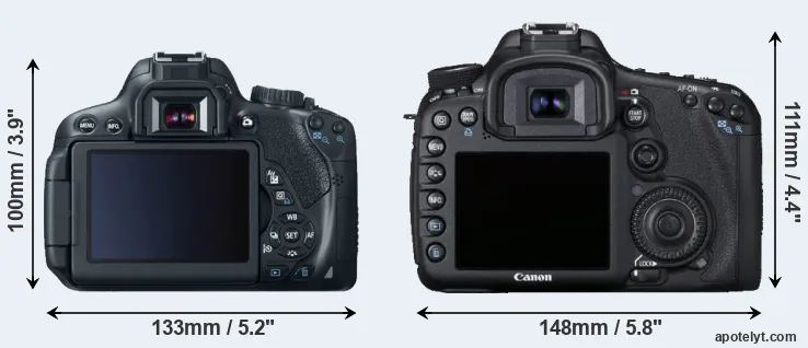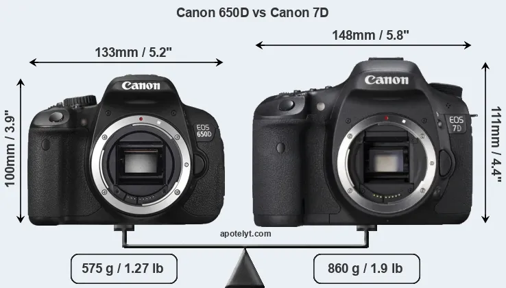 The physical size and weight of the Canon 650D and the Canon 7D are illustrated in the side-by-side display below. The two cameras are presented according to their relative size. Three successive views from the front, the top, and the rear are shown. All width, height and depth measures are rounded to the nearest millimeter.