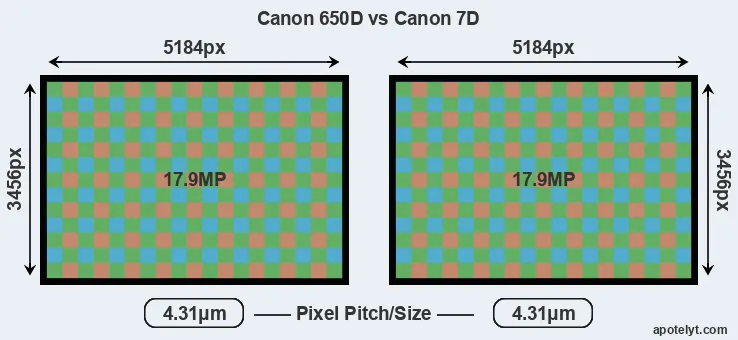 The two cameras under review do not only share the same sensor size, but also offer an identical resolution of 17.9 megapixels. This similarity in sensor specs implies that both the 650D and the 7D have the same pixel density, as well as the same pixel size. It should, however, be noted that the 650D is much more recent (by 2 years and 9 months) than the 7D, and its sensor will have benefitted from technological advances during this time.