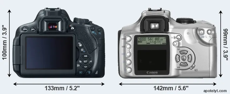 The side-by-side display below illustrates the physical size and weight of the Canon 650D and the Canon Rebel. The two cameras are presented according to their relative size. Three successive views from the front, the top, and the rear are shown. All width, height and depth measures are rounded to the nearest millimeter.