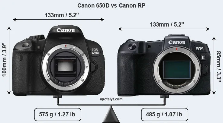 The physical size and weight of the Canon 650D and the Canon RP are illustrated in the side-by-side display below. The two cameras are presented according to their relative size. Three successive views from the front, the top, and the rear are shown. All width, height and depth measures are rounded to the nearest millimeter.