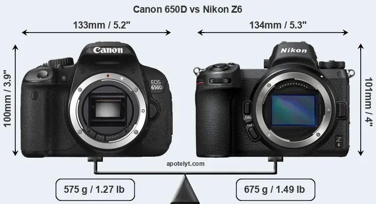 The side-by-side display below illustrates the physical size and weight of the Canon 650D and the Nikon Z6. The two cameras are presented according to their relative size. Three consecutive perspectives from the front, the top, and the back are available. All width, height and depth measures are rounded to the nearest millimeter.