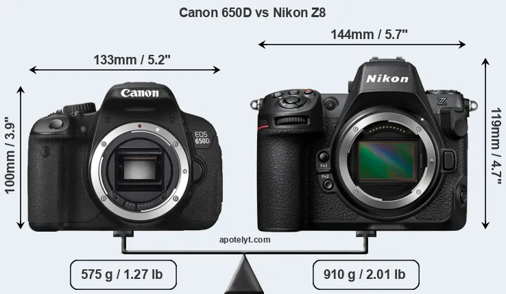 The side-by-side display below illustrates the physical size and weight of the Canon 650D and the Nikon Z8. The two cameras are presented according to their relative size. Three consecutive perspectives from the front, the top, and the back are available. All width, height and depth dimensions are rounded to the nearest millimeter.
