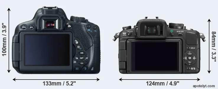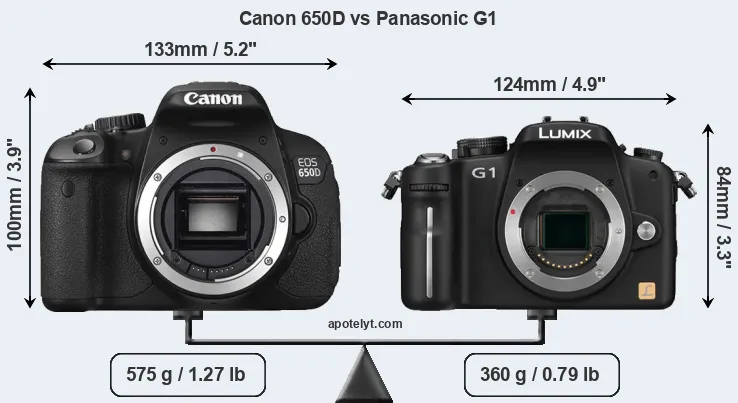 The physical size and weight of the Canon 650D and the Panasonic G1 are illustrated in the side-by-side display below. The two cameras are presented according to their relative size. Three consecutive perspectives from the front, the top, and the back are available. All width, height and depth measures are rounded to the nearest millimeter.