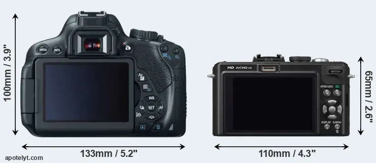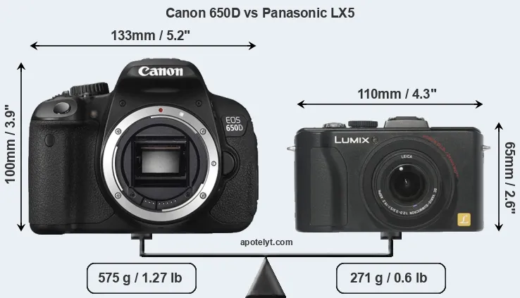 The side-by-side display below illustrates the physical size and weight of the Canon 650D and the Panasonic LX5. The two cameras are presented according to their relative size. Three consecutive perspectives from the front, the top, and the back are available. All width, height and depth measures are rounded to the nearest millimeter.