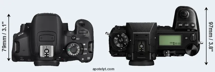 An illustration of the physical size and weight of the Canon 650D and the Panasonic S1 is provided in the side-by-side display below. The two cameras are presented according to their relative size. Three consecutive views from the front, the top, and the rear side are shown. All size dimensions are rounded to the nearest millimeter.