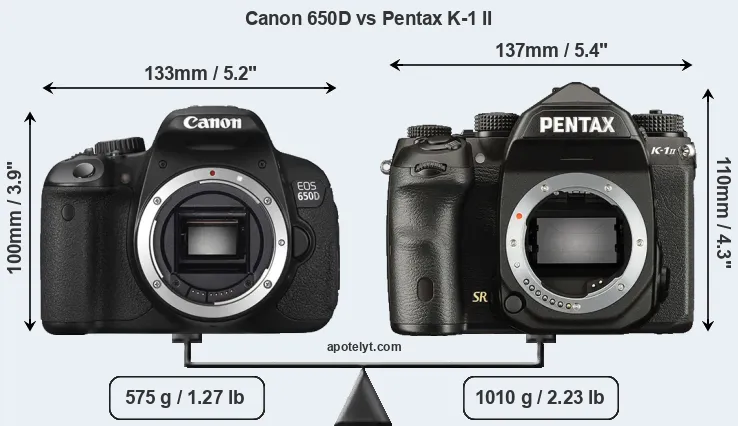If the front view area (width x height) of the cameras is taken as an aggregate measure of their size, the Pentax K-1 II is notably larger (13 percent) than the Canon 650D. Moreover, the K-1 II is substantially heavier (76 percent) than the 650D. It is noteworthy in this context that the K-1 II is splash and dust-proof, while the 650D does not feature any corresponding weather-sealing.