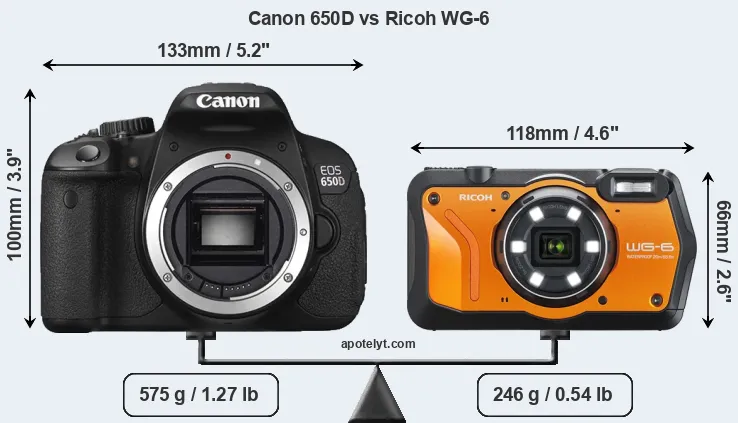 An illustration of the physical size and weight of the Canon 650D and the Ricoh WG-6 is provided in the side-by-side display below. The two cameras are presented according to their relative size. Three consecutive views from the front, the top, and the rear side are shown. All width, height and depth measures are rounded to the nearest millimeter.