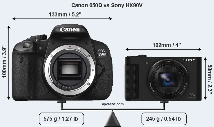 The physical size and weight of the Canon 650D and the Sony HX90V are illustrated in the side-by-side display below. The two cameras are presented according to their relative size. Three successive views from the front, the top, and the rear are shown. All width, height and depth measures are rounded to the nearest millimeter.