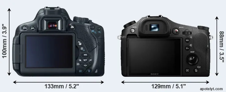 The side-by-side display below illustrates the physical size and weight of the Canon 650D and the Sony RX10 II. The two cameras are presented according to their relative size. Three consecutive perspectives from the front, the top, and the back are available. All width, height and depth measures are rounded to the nearest millimeter.