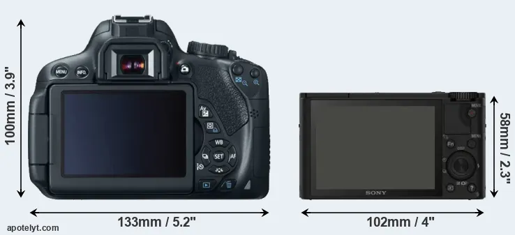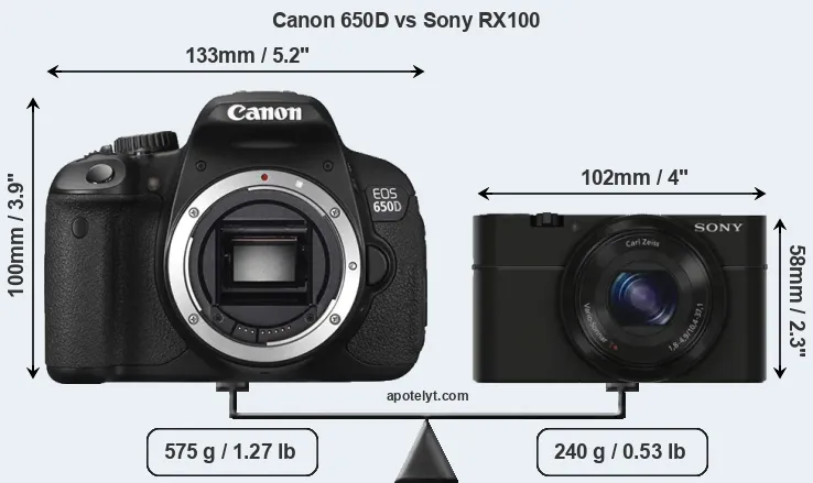 The side-by-side display below illustrates the physical size and weight of the Canon 650D and the Sony RX100. The two cameras are presented according to their relative size. Three consecutive views from the front, the top, and the rear side are shown. All width, height and depth dimensions are rounded to the nearest millimeter.