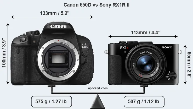 An illustration of the physical size and weight of the Canon 650D and the Sony RX1R II is provided in the side-by-side display below. The two cameras are presented according to their relative size. Three consecutive perspectives from the front, the top, and the back are available. All width, height and depth measures are rounded to the nearest millimeter.