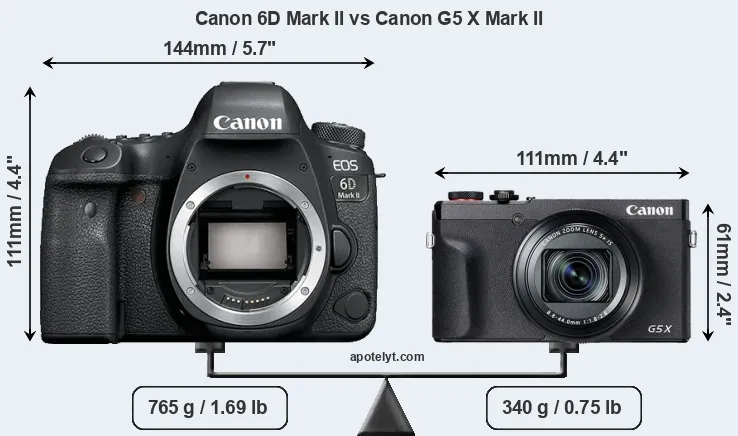 If the front view area (width x height) of the cameras is taken as an aggregate measure of their size, the Canon G5 X Mark II is considerably smaller (58 percent) than the Canon 6D Mark II. It is worth mentioning in this context that the 6D Mark II is splash and dust resistant, while the G5X Mark II does not feature any corresponding weather-sealing.