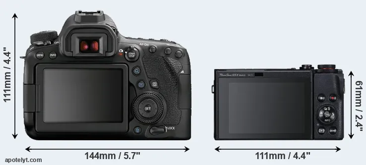 The side-by-side display below illustrates the physical size and weight of the Canon 6D Mark II and the Canon G5 X Mark II. The two cameras are presented according to their relative size. Three consecutive views from the front, the top, and the rear side are shown. All size dimensions are rounded to the nearest millimeter.
