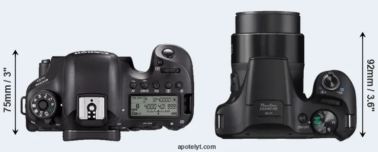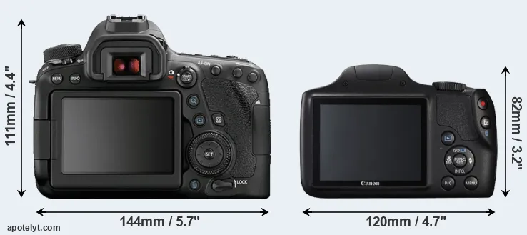 The side-by-side display below illustrates the physical size and weight of the Canon 6D Mark II and the Canon SX540. The two cameras are presented according to their relative size. Three consecutive views from the front, the top, and the rear side are shown. All width, height and depth dimensions are rounded to the nearest millimeter.