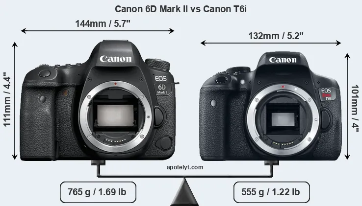 The physical size and weight of the Canon 6D Mark II and the Canon T6i are illustrated in the side-by-side display below. The two cameras are presented according to their relative size. Three consecutive views from the front, the top, and the rear side are shown. All size dimensions are rounded to the nearest millimeter.