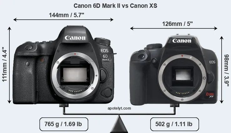 If the front view area (width x height) of the cameras is taken as an aggregate measure of their size, the Canon XS is notably smaller (23 percent) than the Canon 6D Mark II. Moreover, the XS is markedly lighter (34 percent) than the 6D Mark II. It is worth mentioning in this context that the 6D Mark II is splash and dust resistant, while the XS does not feature any corresponding weather-sealing.