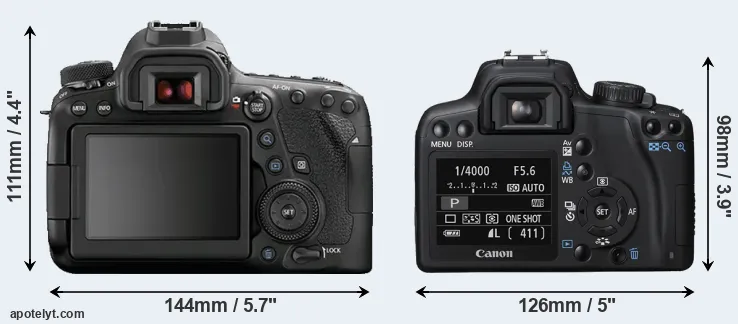The physical size and weight of the Canon 6D Mark II and the Canon XS are illustrated in the side-by-side display below. The two cameras are presented according to their relative size. Three consecutive views from the front, the top, and the rear side are shown. All size dimensions are rounded to the nearest millimeter.