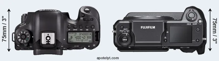 The side-by-side display below illustrates the physical size and weight of the Canon 6D Mark II and the Fujifilm GFX 100. The two cameras are presented according to their relative size. Three consecutive views from the front, the top, and the rear side are shown. All width, height and depth measures are rounded to the nearest millimeter.