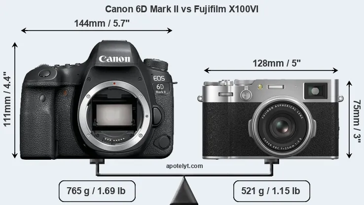 An illustration of the physical size and weight of the Canon 6D Mark II and the Fujifilm X100VI is provided in the side-by-side display below. The two cameras are presented according to their relative size. Three consecutive views from the front, the top, and the rear side are shown. All width, height and depth dimensions are rounded to the nearest millimeter.