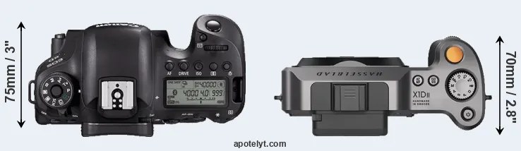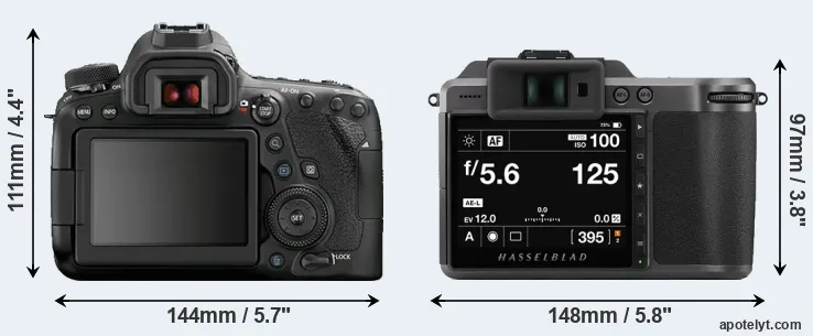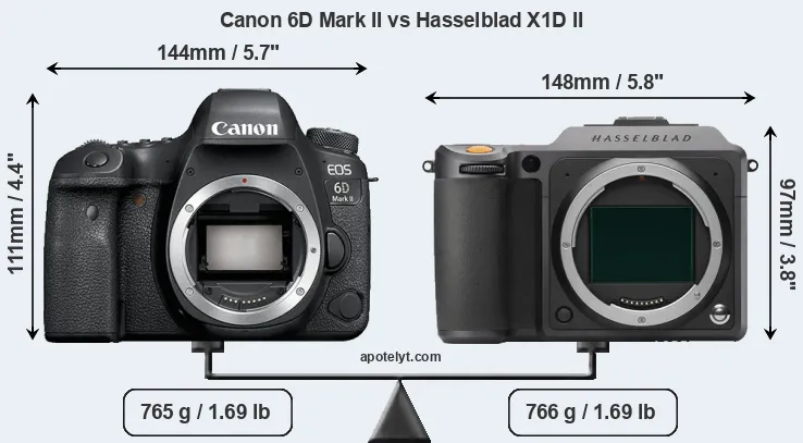 The side-by-side display below illustrates the physical size and weight of the Canon 6D Mark II and the Hasselblad X1D II. The two cameras are presented according to their relative size. Three consecutive perspectives from the front, the top, and the back are available. All width, height and depth measures are rounded to the nearest millimeter.