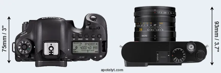The side-by-side display below illustrates the physical size and weight of the Canon 6D Mark II and the Leica Q3. The two cameras are presented according to their relative size. Three consecutive perspectives from the front, the top, and the back are available. All size dimensions are rounded to the nearest millimeter.