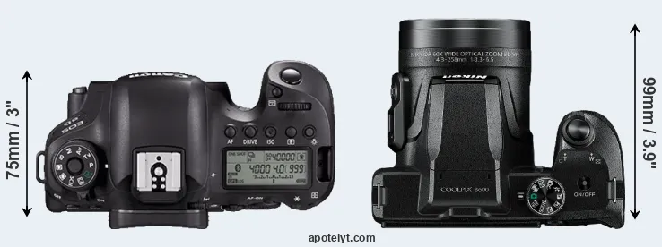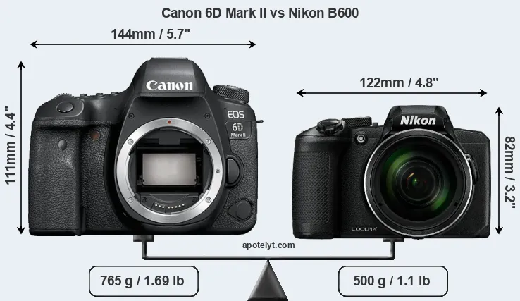 An illustration of the physical size and weight of the Canon 6D Mark II and the Nikon B600 is provided in the side-by-side display below. The two cameras are presented according to their relative size. Three consecutive perspectives from the front, the top, and the back are available. All size dimensions are rounded to the nearest millimeter.