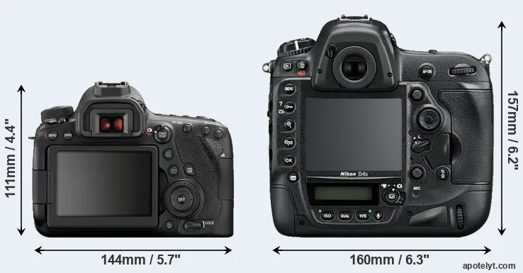The physical size and weight of the Canon 6D Mark II and the Nikon D4S are illustrated in the side-by-side display below. The two cameras are presented according to their relative size. Three successive views from the front, the top, and the rear are shown. All width, height and depth measures are rounded to the nearest millimeter.
