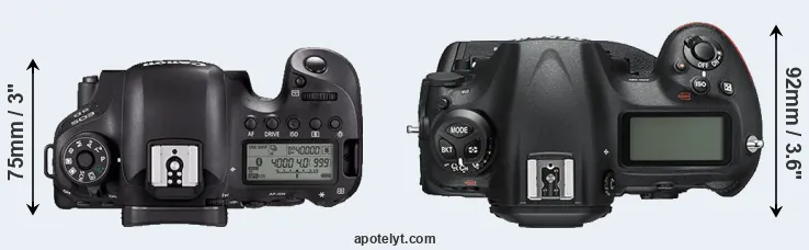 The side-by-side display below illustrates the physical size and weight of the Canon 6D Mark II and the Nikon D5. The two cameras are presented according to their relative size. Three consecutive views from the front, the top, and the rear side are shown. All width, height and depth dimensions are rounded to the nearest millimeter.