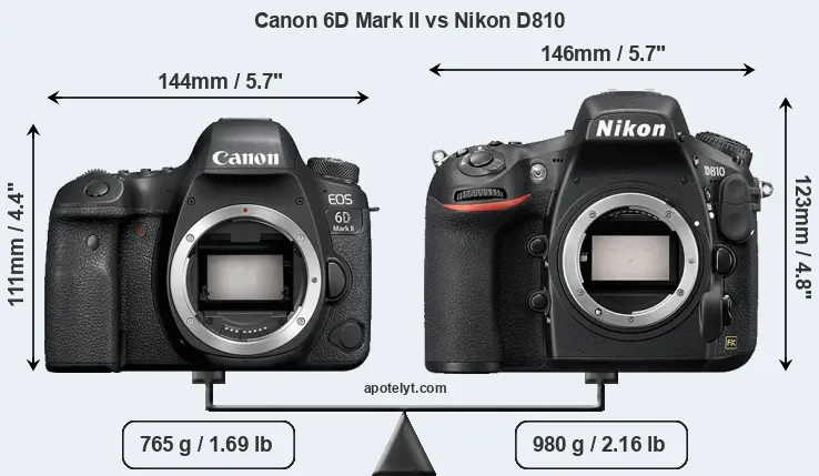 An illustration of the physical size and weight of the Canon 6D Mark II and the Nikon D810 is provided in the side-by-side display below. The two cameras are presented according to their relative size. Three successive views from the front, the top, and the rear are shown. All width, height and depth measures are rounded to the nearest millimeter.