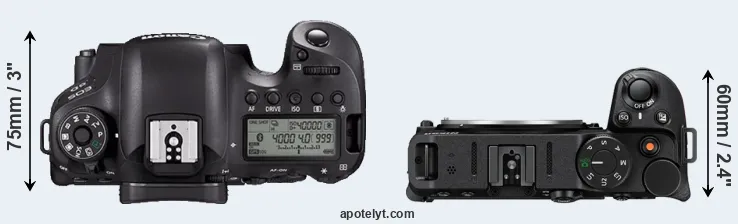The physical size and weight of the Canon 6D Mark II and the Nikon Z30 are illustrated in the side-by-side display below. The two cameras are presented according to their relative size. Three successive views from the front, the top, and the rear are shown. All width, height and depth measures are rounded to the nearest millimeter.