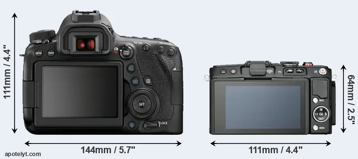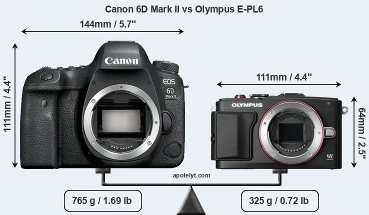 The side-by-side display below illustrates the physical size and weight of the Canon 6D Mark II and the Olympus E-PL6. The two cameras are presented according to their relative size. Three consecutive perspectives from the front, the top, and the back are available. All width, height and depth measures are rounded to the nearest millimeter.