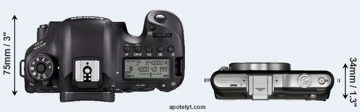 The physical size and weight of the Canon 6D Mark II and the Olympus E-PM1 are illustrated in the side-by-side display below. The two cameras are presented according to their relative size. Three consecutive perspectives from the front, the top, and the back are available. All width, height and depth measures are rounded to the nearest millimeter.