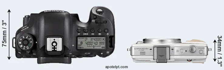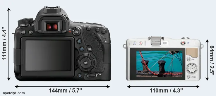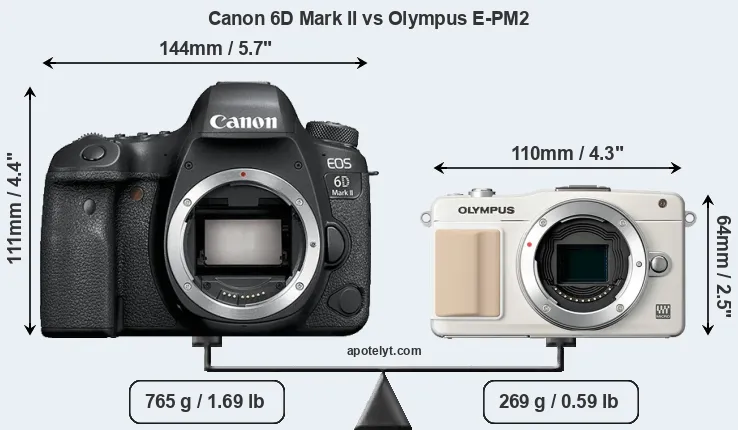 The side-by-side display below illustrates the physical size and weight of the Canon 6D Mark II and the Olympus E-PM2. The two cameras are presented according to their relative size. Three consecutive perspectives from the front, the top, and the back are available. All width, height and depth measures are rounded to the nearest millimeter.