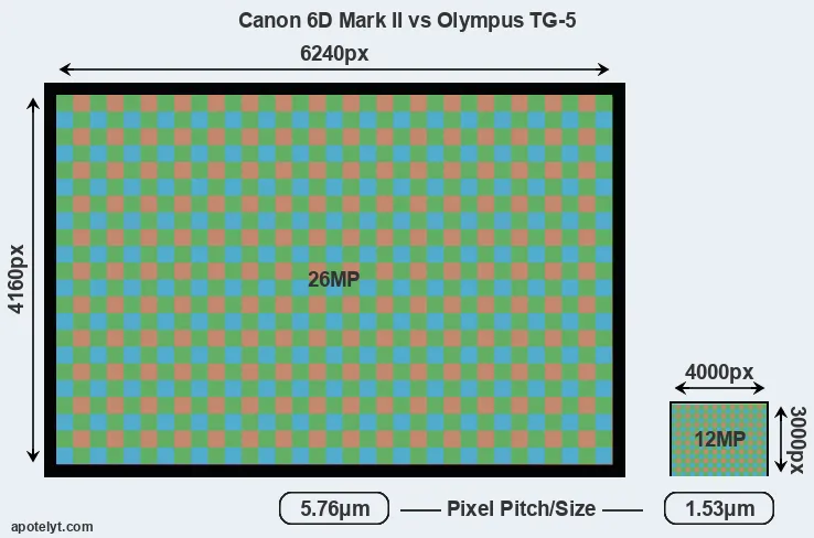 With 26MP, the 6D Mark II offers a higher resolution than the TG-5 (12MP), but the 6D Mark II nevertheless has larger individual pixels (pixel pitch of 5.76μm versus 1.53μm for the TG-5) due to its larger sensor. It is noteworthy in this context that the two cameras were released in close succession, so that their sensors are from the same technological generation.