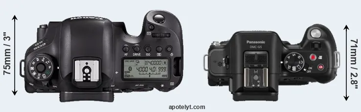 The physical size and weight of the Canon 6D Mark II and the Panasonic G5 are illustrated in the side-by-side display below. The two cameras are presented according to their relative size. Three consecutive perspectives from the front, the top, and the back are available. All size dimensions are rounded to the nearest millimeter.