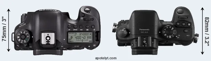 The side-by-side display below illustrates the physical size and weight of the Canon 6D Mark II and the Panasonic GH3. The two cameras are presented according to their relative size. Three consecutive views from the front, the top, and the rear side are shown. All width, height and depth dimensions are rounded to the nearest millimeter.