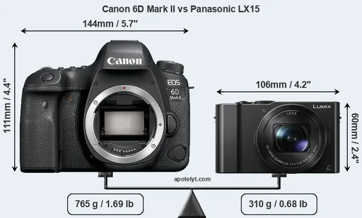 An illustration of the physical size and weight of the Canon 6D Mark II and the Panasonic LX15 is provided in the side-by-side display below. The two cameras are presented according to their relative size. Three successive views from the front, the top, and the rear are shown. All width, height and depth dimensions are rounded to the nearest millimeter.