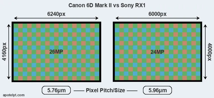 With 26MP, the 6D Mark II offers a slightly higher resolution than the RX1 (24MP), but the 6D Mark II has smaller individual pixels (pixel pitch of 5.76μm versus 5.96μm for the RX1). However, the 6D Mark II is a much more recent model (by 4 years and 9 months) than the RX1, and its sensor will have benefitted from technological advances during this time that enhance the light gathering capacity of its pixels.