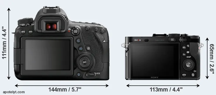 The side-by-side display below illustrates the physical size and weight of the Canon 6D Mark II and the Sony RX1R II. The two cameras are presented according to their relative size. Three consecutive perspectives from the front, the top, and the back are available. All size dimensions are rounded to the nearest millimeter.