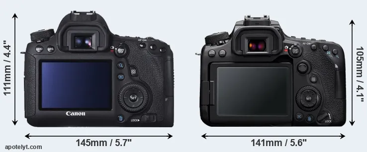 The physical size and weight of the Canon 6D and the Canon 90D are illustrated in the side-by-side display below. The two cameras are presented according to their relative size. Three successive views from the front, the top, and the rear are shown. All width, height and depth dimensions are rounded to the nearest millimeter.