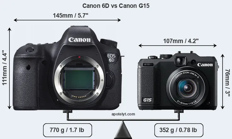 The side-by-side display below illustrates the physical size and weight of the Canon 6D and the Canon G15. The two cameras are presented according to their relative size. Three consecutive views from the front, the top, and the rear side are shown. All width, height and depth dimensions are rounded to the nearest millimeter.