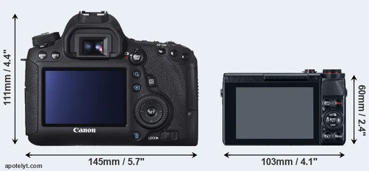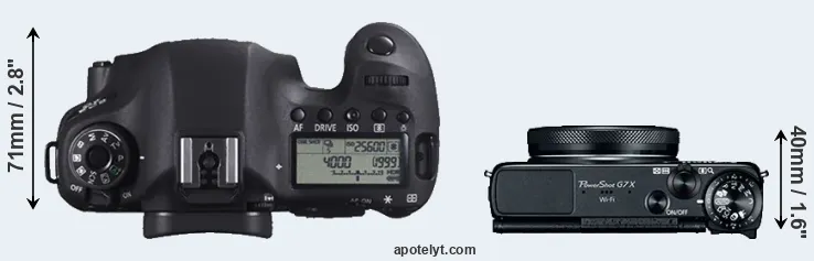 An illustration of the physical size and weight of the Canon 6D and the Canon G7 X is provided in the side-by-side display below. The two cameras are presented according to their relative size. Three successive views from the front, the top, and the rear are shown. All width, height and depth dimensions are rounded to the nearest millimeter.