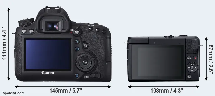 The side-by-side display below illustrates the physical size and weight of the Canon 6D and the Canon M200. The two cameras are presented according to their relative size. Three successive views from the front, the top, and the rear are shown. All width, height and depth dimensions are rounded to the nearest millimeter.