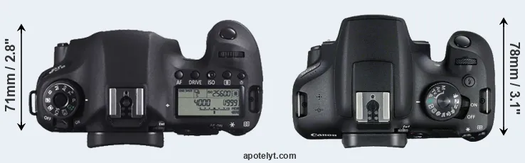The side-by-side display below illustrates the physical size and weight of the Canon 6D and the Canon T7. The two cameras are presented according to their relative size. Three successive views from the front, the top, and the rear are shown. All width, height and depth dimensions are rounded to the nearest millimeter.