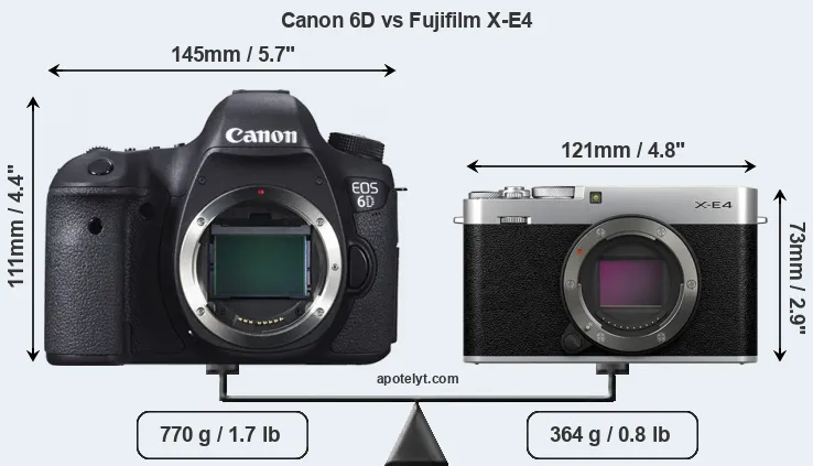 The physical size and weight of the Canon 6D and the Fujifilm X-E4 are illustrated in the side-by-side display below. The two cameras are presented according to their relative size. Three consecutive views from the front, the top, and the rear side are shown. All size dimensions are rounded to the nearest millimeter.
