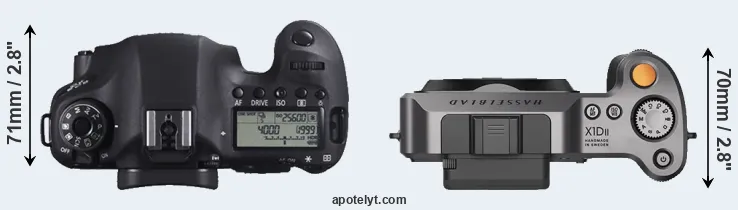 The physical size and weight of the Canon 6D and the Hasselblad X1D II are illustrated in the side-by-side display below. The two cameras are presented according to their relative size. Three consecutive views from the front, the top, and the rear side are shown. All width, height and depth measures are rounded to the nearest millimeter.