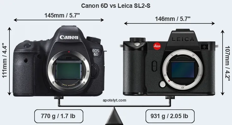 The side-by-side display below illustrates the physical size and weight of the Canon 6D and the Leica SL2-S. The two cameras are presented according to their relative size. Three consecutive views from the front, the top, and the rear side are shown. All width, height and depth measures are rounded to the nearest millimeter.