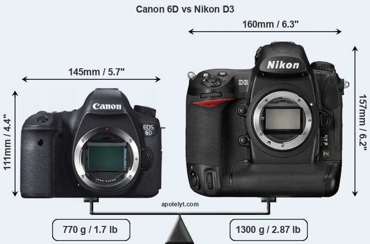 The physical size and weight of the Canon 6D and the Nikon D3 are illustrated in the side-by-side display below. The two cameras are presented according to their relative size. Three consecutive perspectives from the front, the top, and the back are available. All size dimensions are rounded to the nearest millimeter.